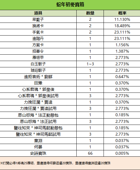 8000元寶可購買50個蛇年初冬寶箱(何晏、童淵、田豫),限購20次