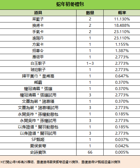198/1950/3800/8888元寶可購買1個/10個/20個/50個蛇年初冬禮包(夏侯紫萼、SP甄姬、臧霸),限購999次