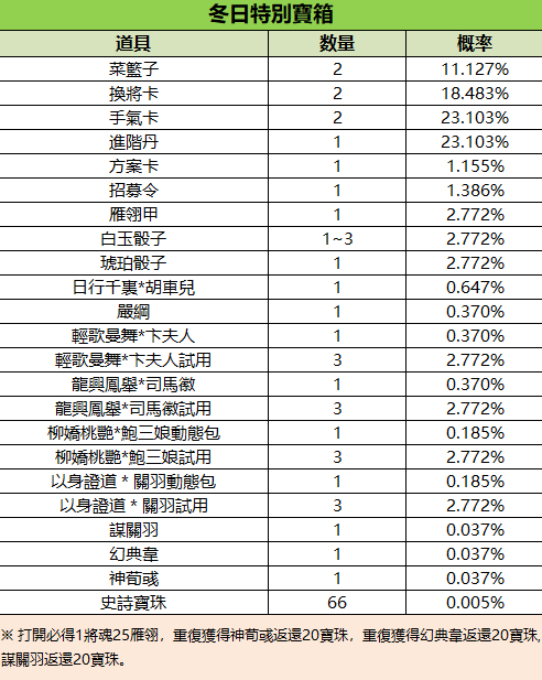 300/2999/5666/14000元寶可購買1個/10個/20個/50個冬日特別寶箱(神荀彧、幻典韋、謀關羽、嚴綱)