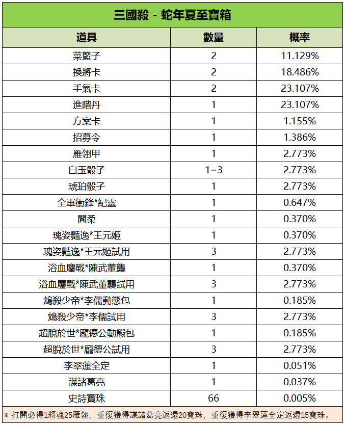 3800元寶可購買蛇年夏至寶箱(李翠蓮全定、謀諸葛亮、閻柔)20個