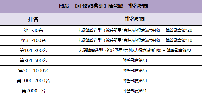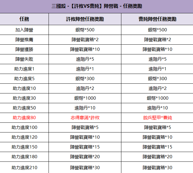 加入【許攸陣營】或【曹純陣營】助威累積進度,進度達標可解鎖不同任務獎勵, 排名靠前還可獲得武將專屬造型獎勵!