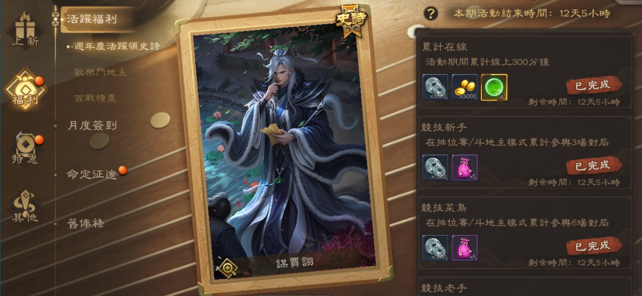 活動介紹:活動期間,主公完成活躍任務可獲得史詩武將「謀賈詡」、史詩寶珠等游戲好禮。