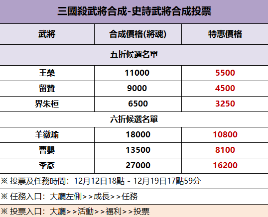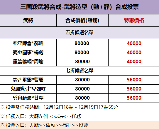 活動介紹:完成遊戲任務領取投票券,投給你想要特價合成的武將或造型!