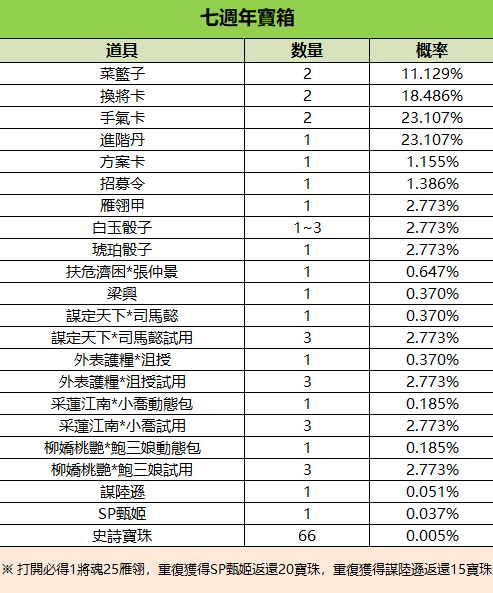 198/1950/3800/8888元寶可購買1個/10個/20個/50個七週年寶箱(SP甄姬、謀陸遜、梁興),限購999次