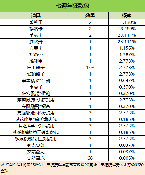 198/1950/3800/8888元寶可購買1個/10個/20個/50個七週年狂歡包(友諸葛亮、勢太史慈、玉真子),限購999次