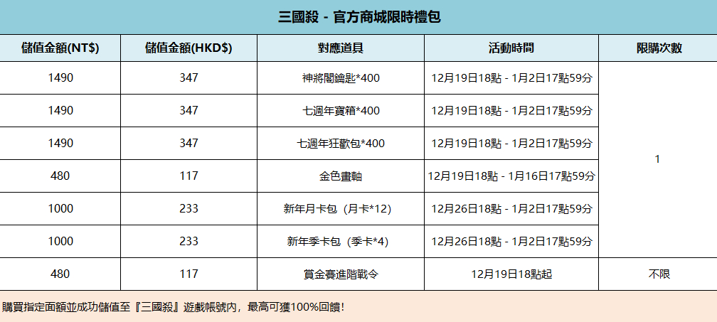 【#三國殺 共創佳七 | 儲值限時返利&禮包活動】七周年雙倍儲值返利限時開啓,限時禮包新增金色畫軸、賞金賽戰令!