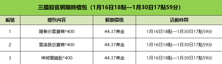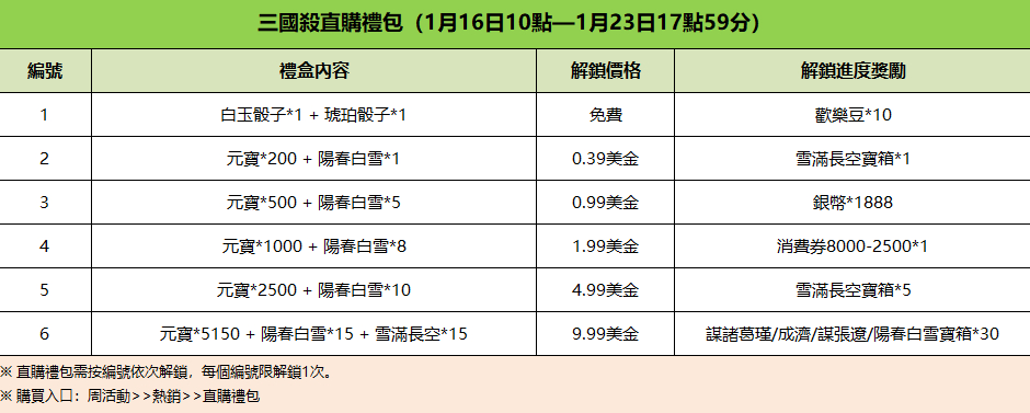 ①官網限時禮包 ⏰活動時間:1月16日18點 - 1月30日17點59分 💠商城入口:【點擊官網右上角“儲值入口”】→【進入官方商城 】 禮包内容詳見配圖
