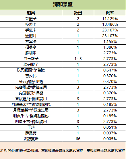 198/1950/3800/8888元寶可購買1個/10個/20個/50個清和景盛寶箱(王越、薛靈芸、曹安民),限購999次