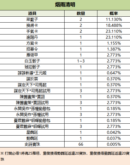 198/1950/3800/8888元寶可購買1個/10個/20個/50個烟雨清明寶箱(勢魏延、星魏延、謀於禁),限購999次