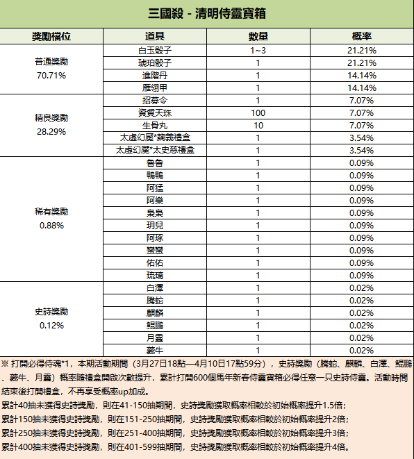 300/2999/5666/14000元寶可購買1個/10個/20/個50個清明侍靈寶箱,每人限購999次
