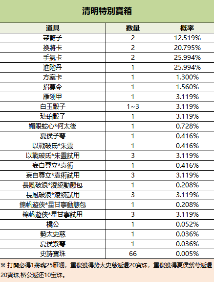 300/2999/5666/14000元寶可購買1個/10個/20個/50個清明特別寶箱(夏侯紫萼、橋公、勢太史慈、夏侯子萼),限購999次