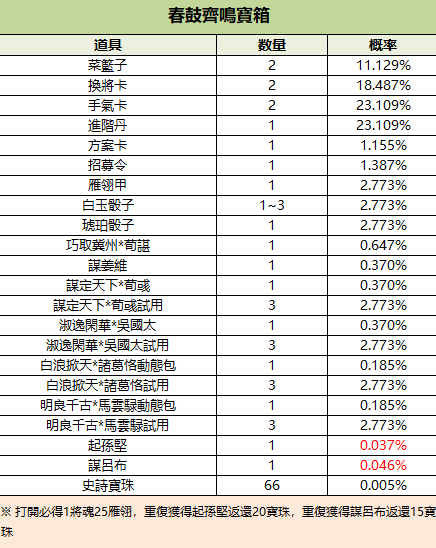 198/1950/3800/8888元寶可購買1個/10個/20個/50個春鼓齊鳴寶箱(謀呂布、起孫堅、謀姜維),限購999次