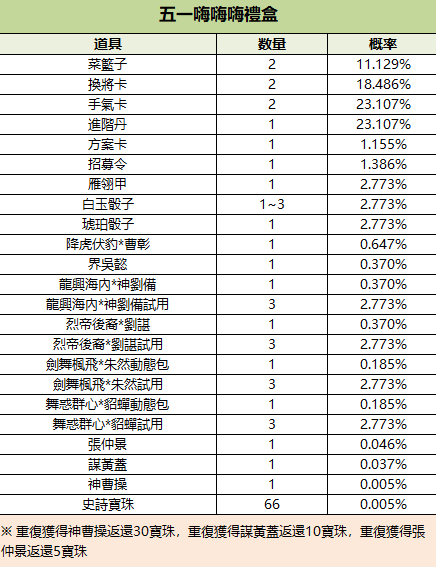 活動期間完成指定遊戲任務,達成全部目標後可自選領取謀賈詡/起劉備/裴秀/花鬘/五一嗨嗨嗨禮盒×188。