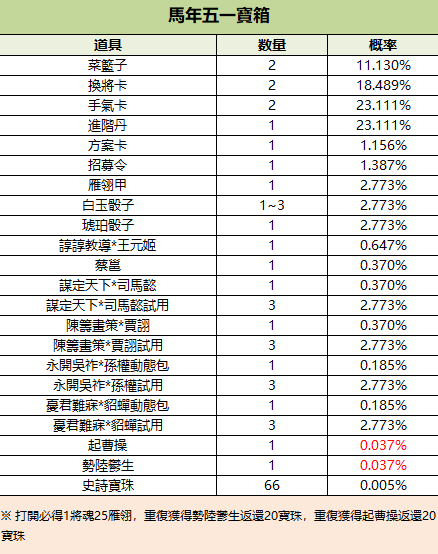 198/1950/3800/8888元寶可購買1個/10個/20個/50個馬年五一寶箱(勢陸鬱生、起曹操、蔡邕),限購999次