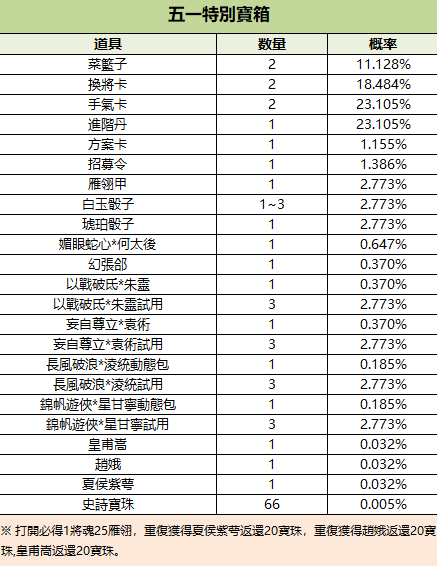 300/2999/5666/14000元寶可購買1個/10個/20個/50個五一特別寶箱(夏侯紫萼、皇甫嵩、趙娥、幻張郃),限購999次