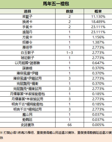 198/1950/3800/8888元寶可購買1個/10個/20個/50個馬年五一禮包(勢魏延、龐山民、謀姜維),限購999次
